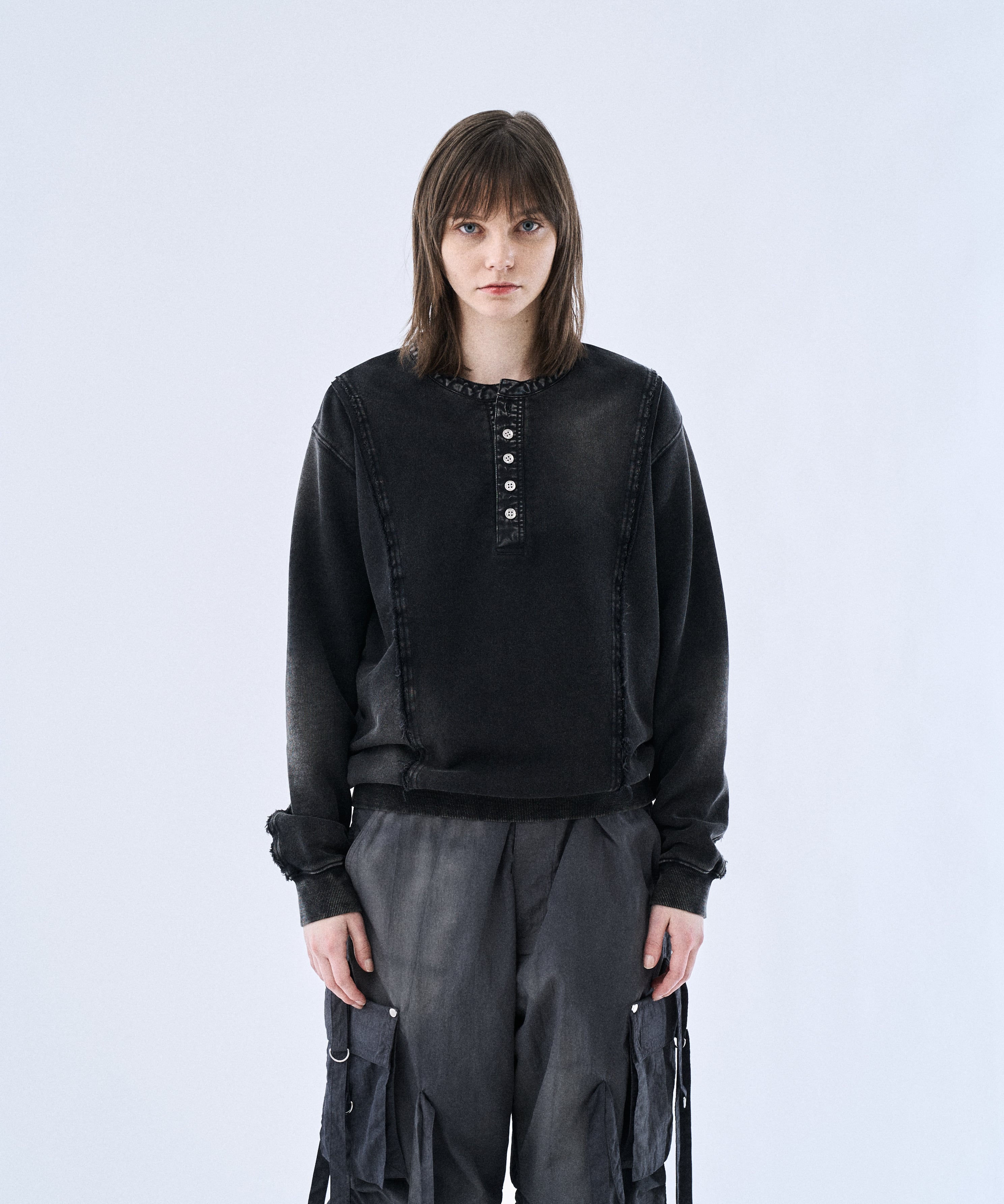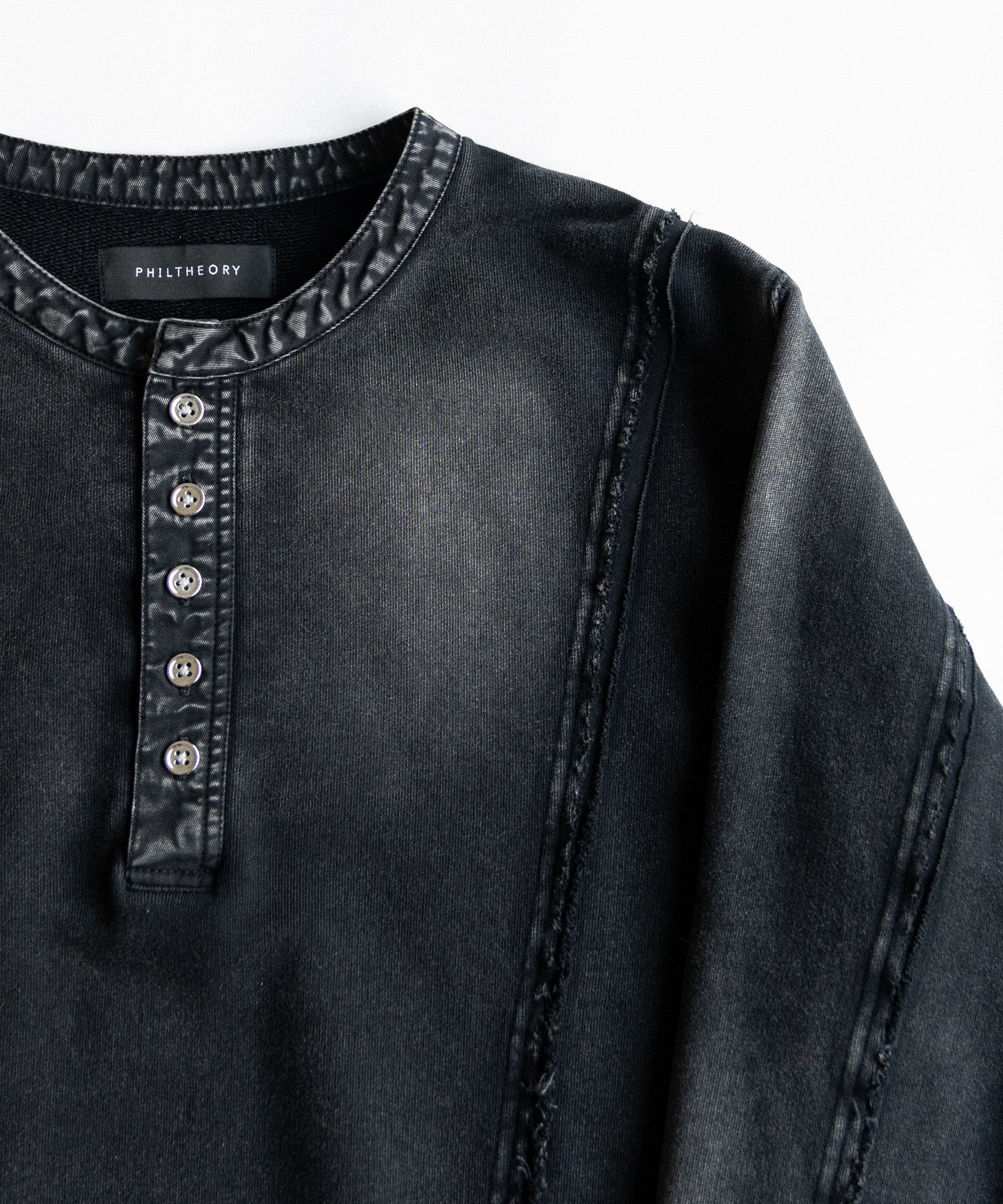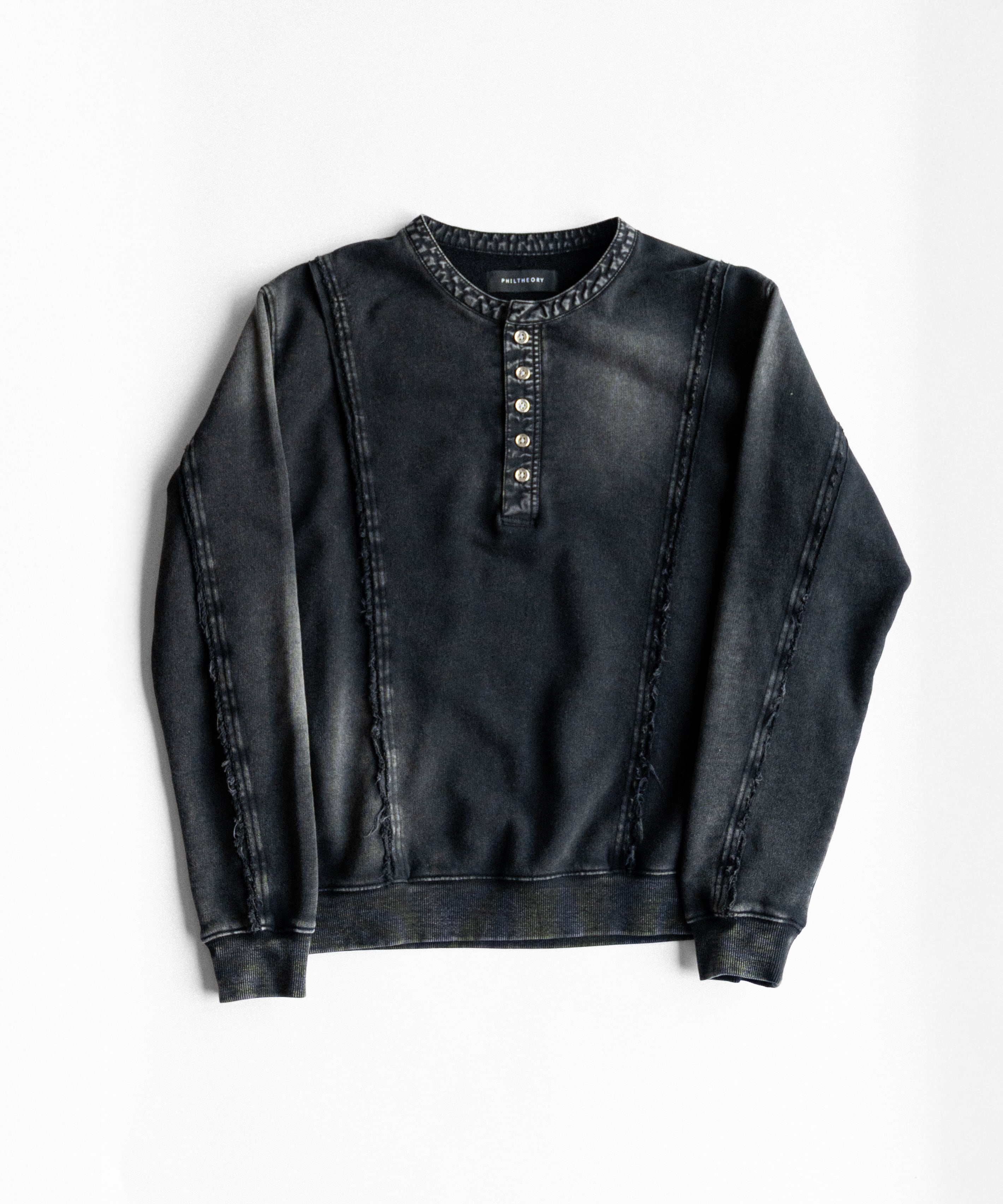 ヴィンテージライクなフェード感と、ヘンリーネックのメタルボタンがアクセントになる「Metal button henly sweat」。スウェットのラフさに、首元のボタンディテールで程よい品を足した一枚です。切替ラインのデザインが立体感を生み、1枚で着てもサマになるバランスに。シャツやタートルをインナーに入れてレイヤードしても良く、秋冬〜春先までロングシーズン活躍します。カラーは深みのあるNavyと、引き締まるBlackの2色展開。