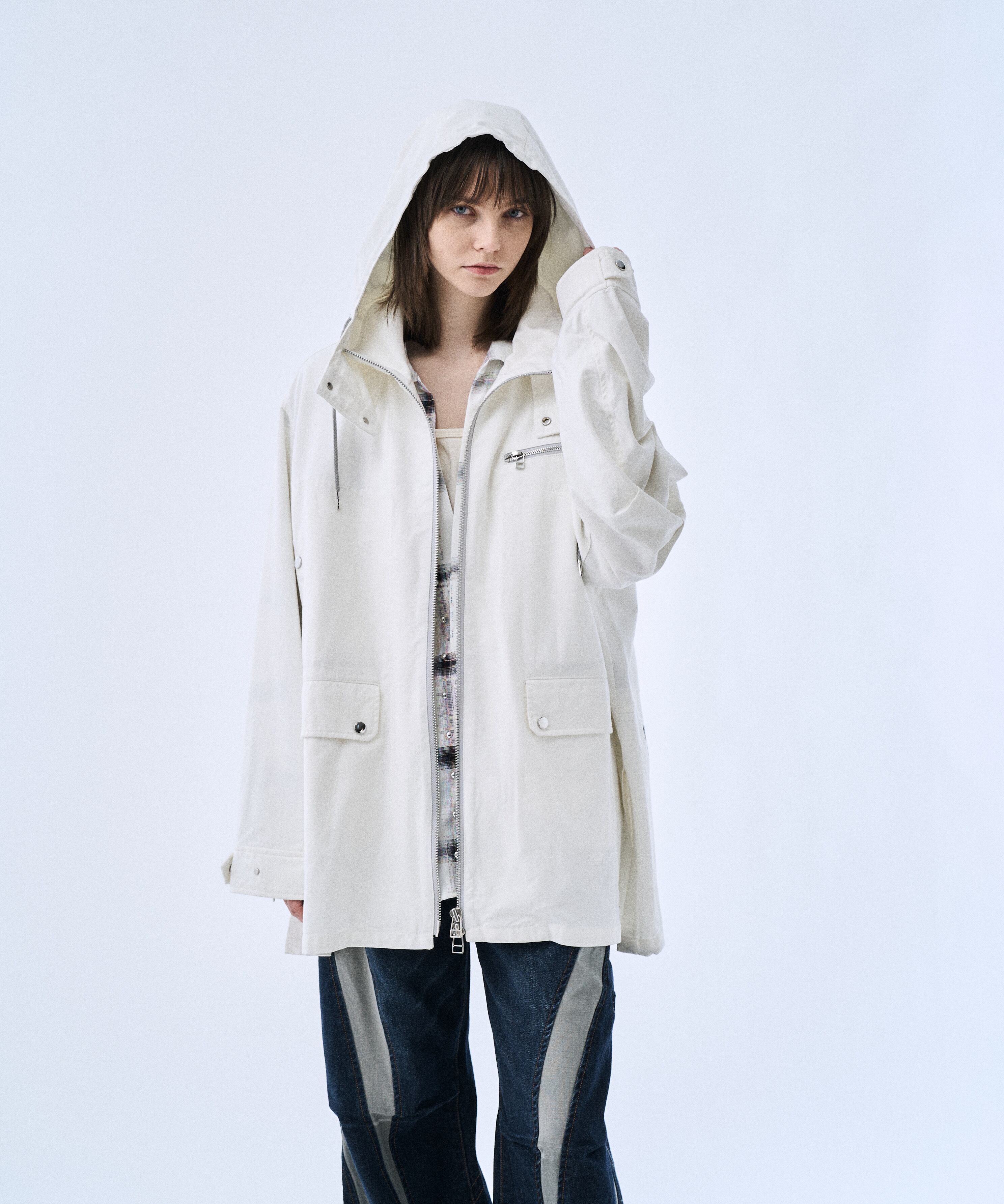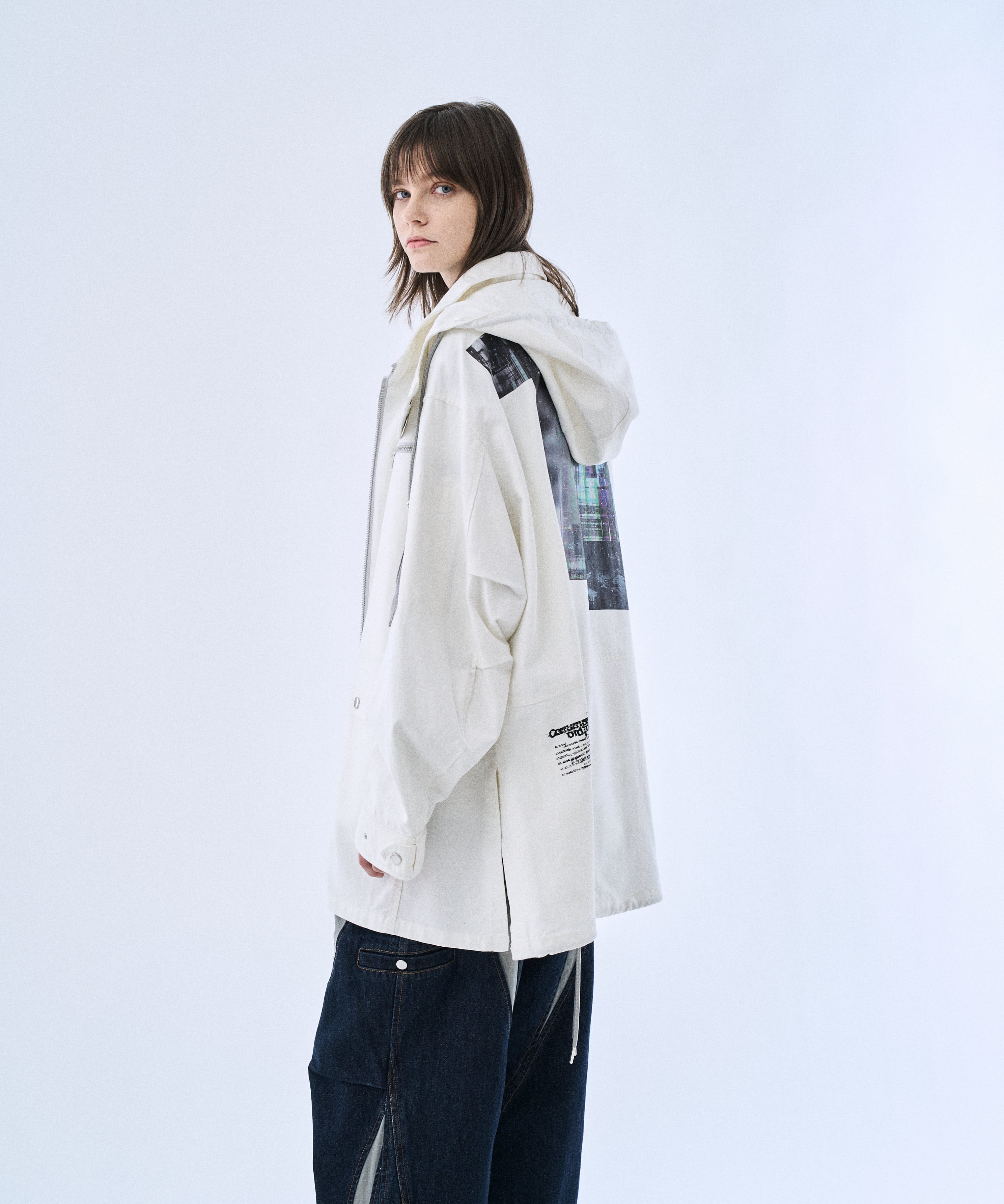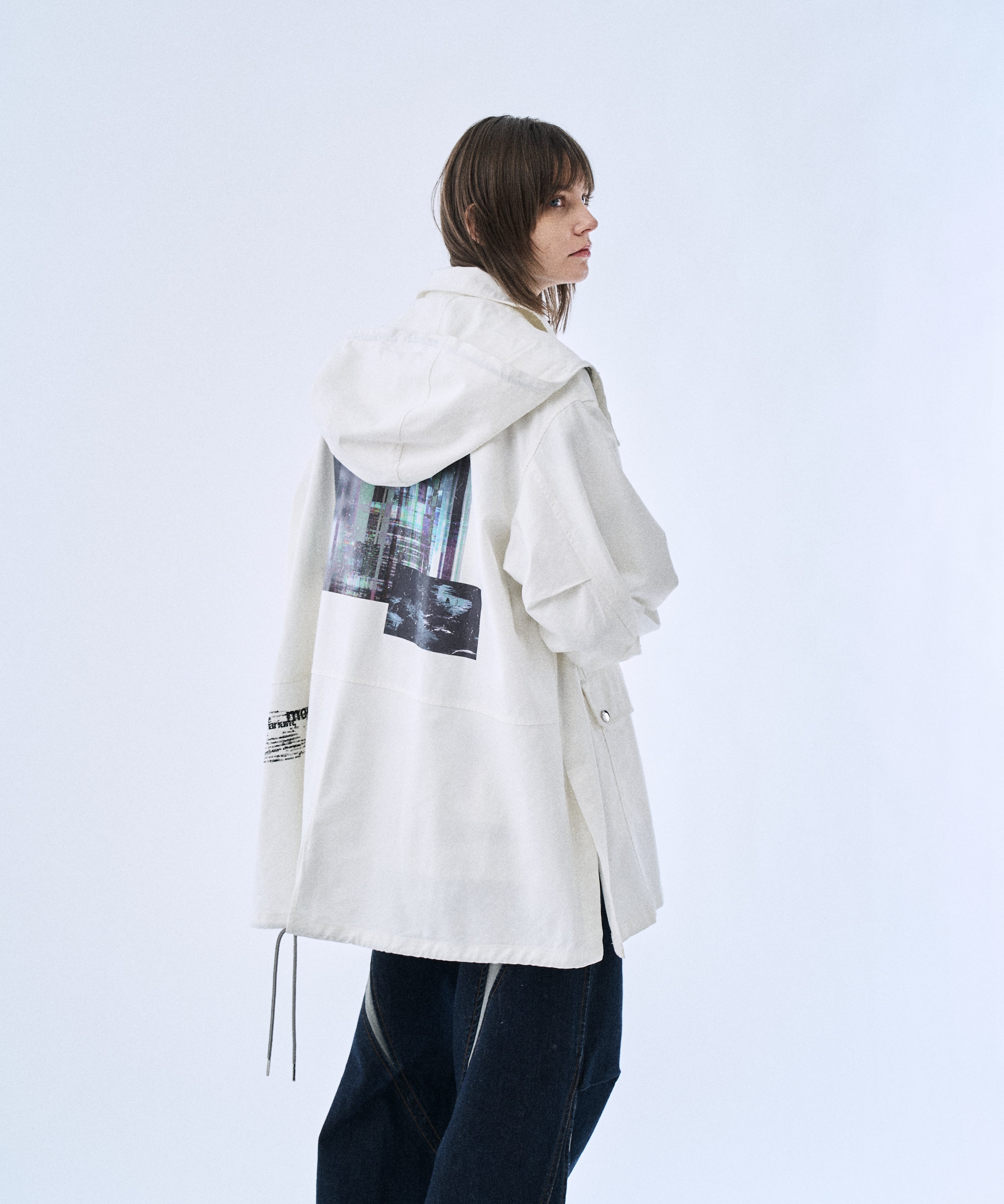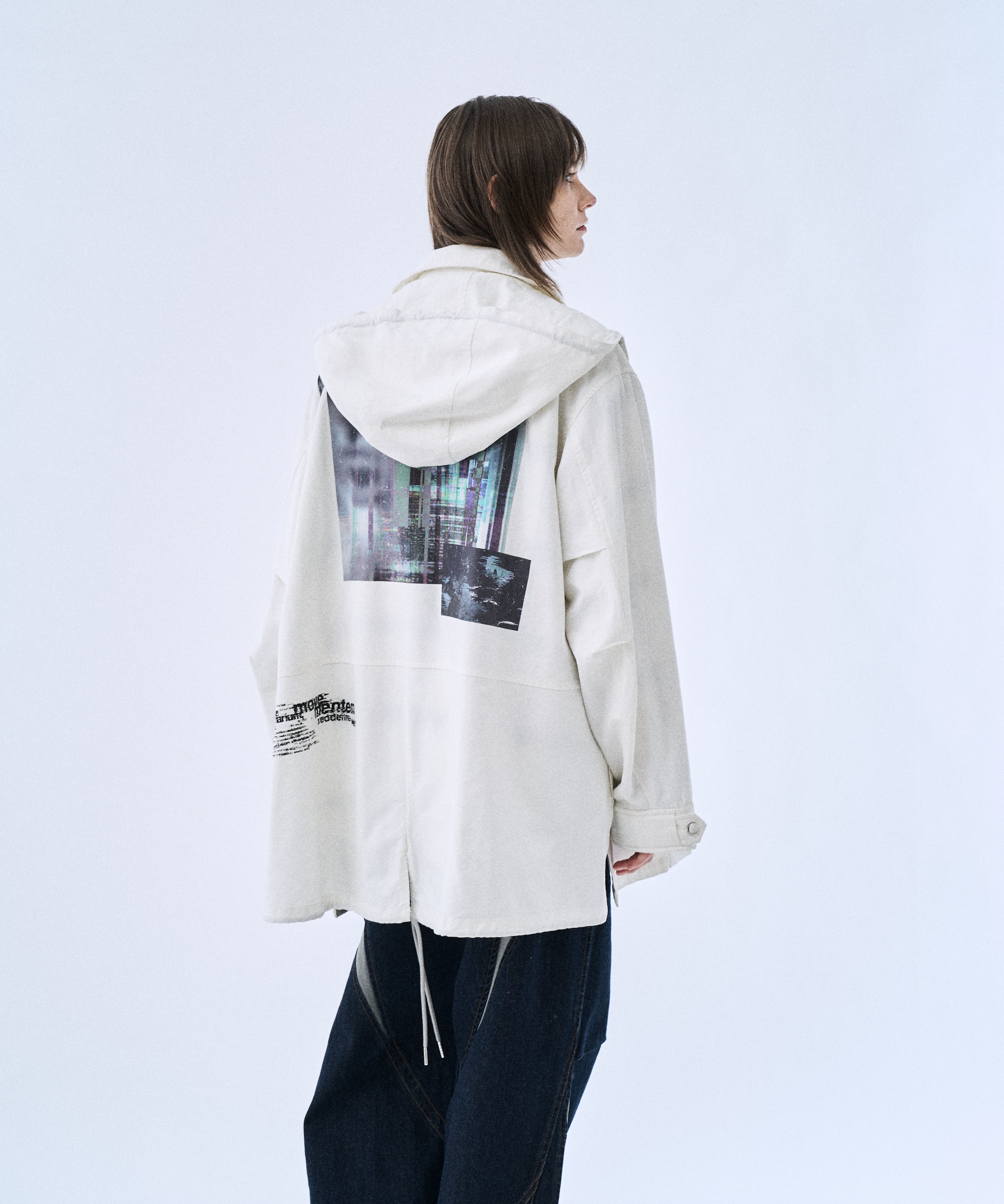 ミリタリーパーカーをベースに、背面グラフィックでアクセントを加えた「Back graphic military parker」。程よくゆとりのあるシルエットとフードデザインで、Tシャツやスウェットの上からラフに羽織るだけでスタイリングが完成します。フロントはジップ仕様、裾はドローコードでシルエット調整が可能。軽さと落ち感のあるレーヨン混素材で、無骨すぎずモードに着られるのもポイントです。カラーは引き締まるBlackと、クリーンに着られるWhiteの2色展開。