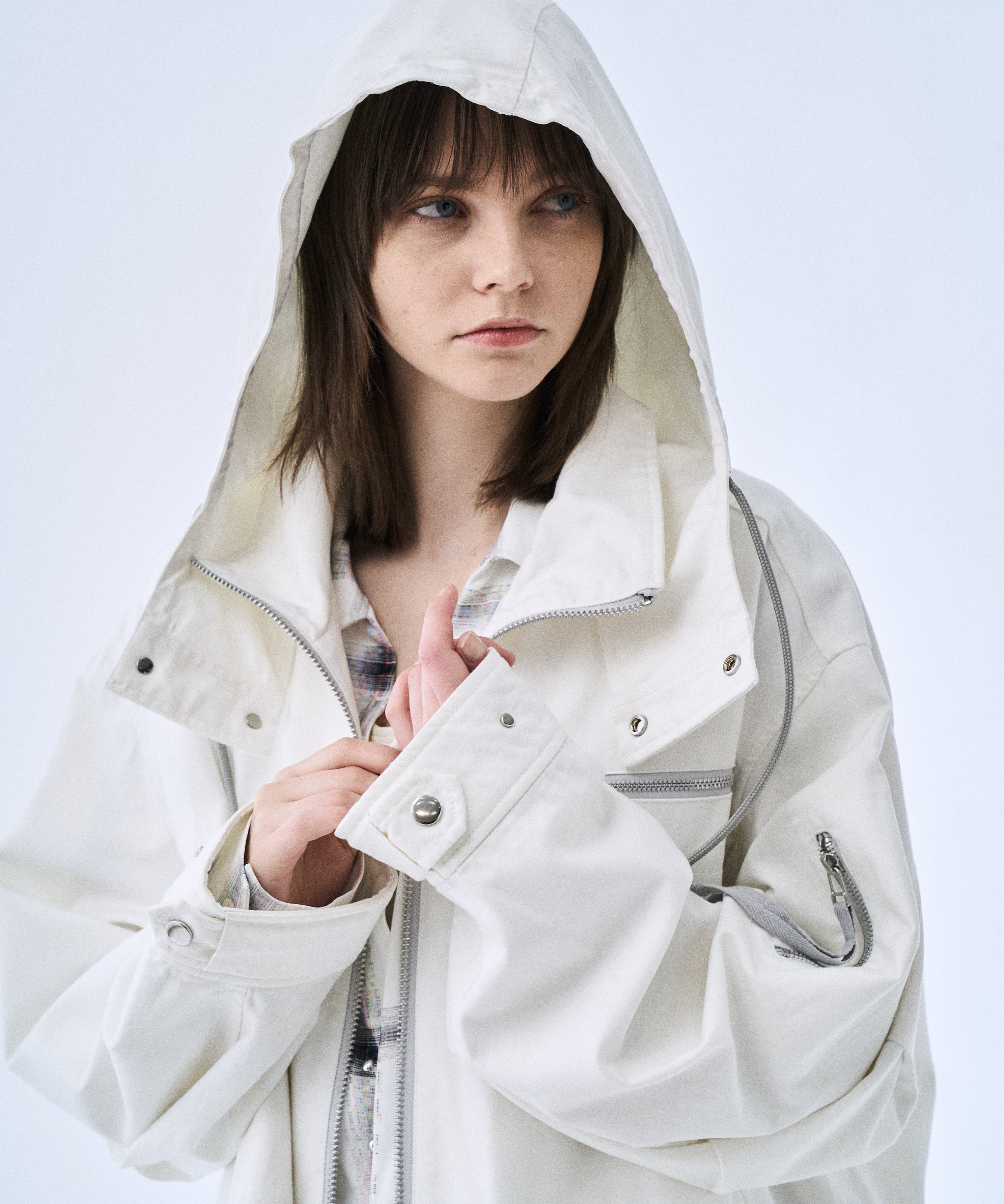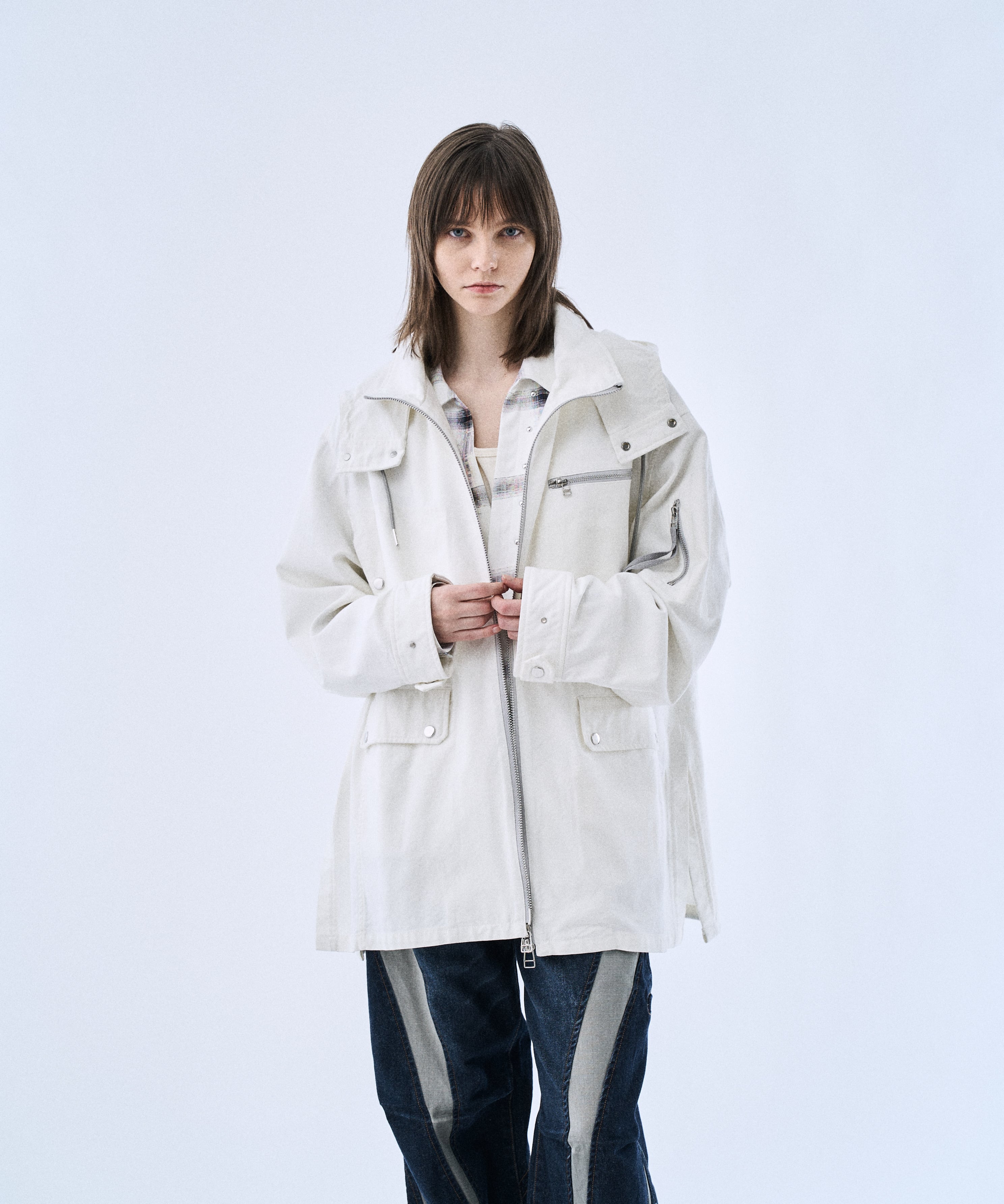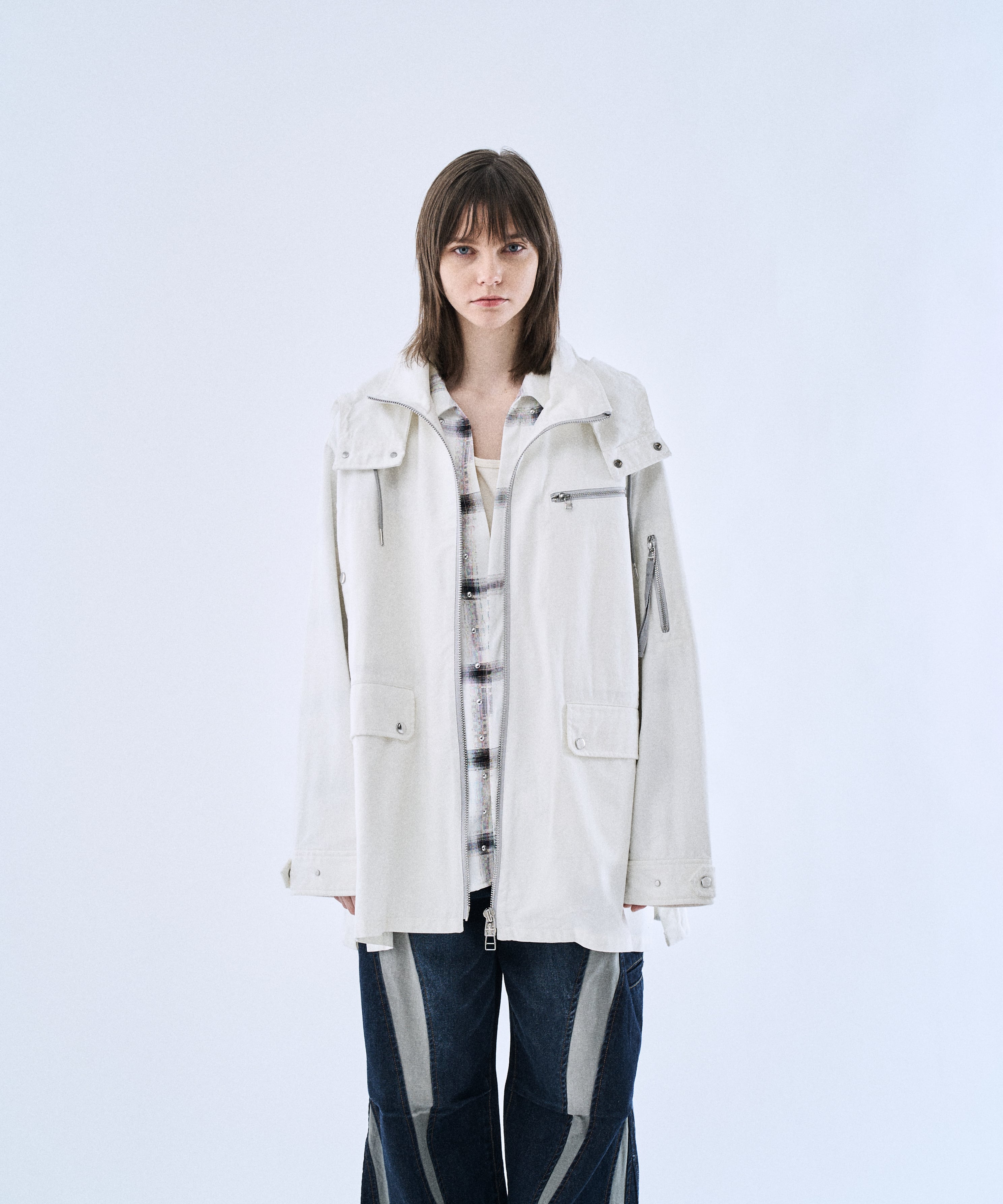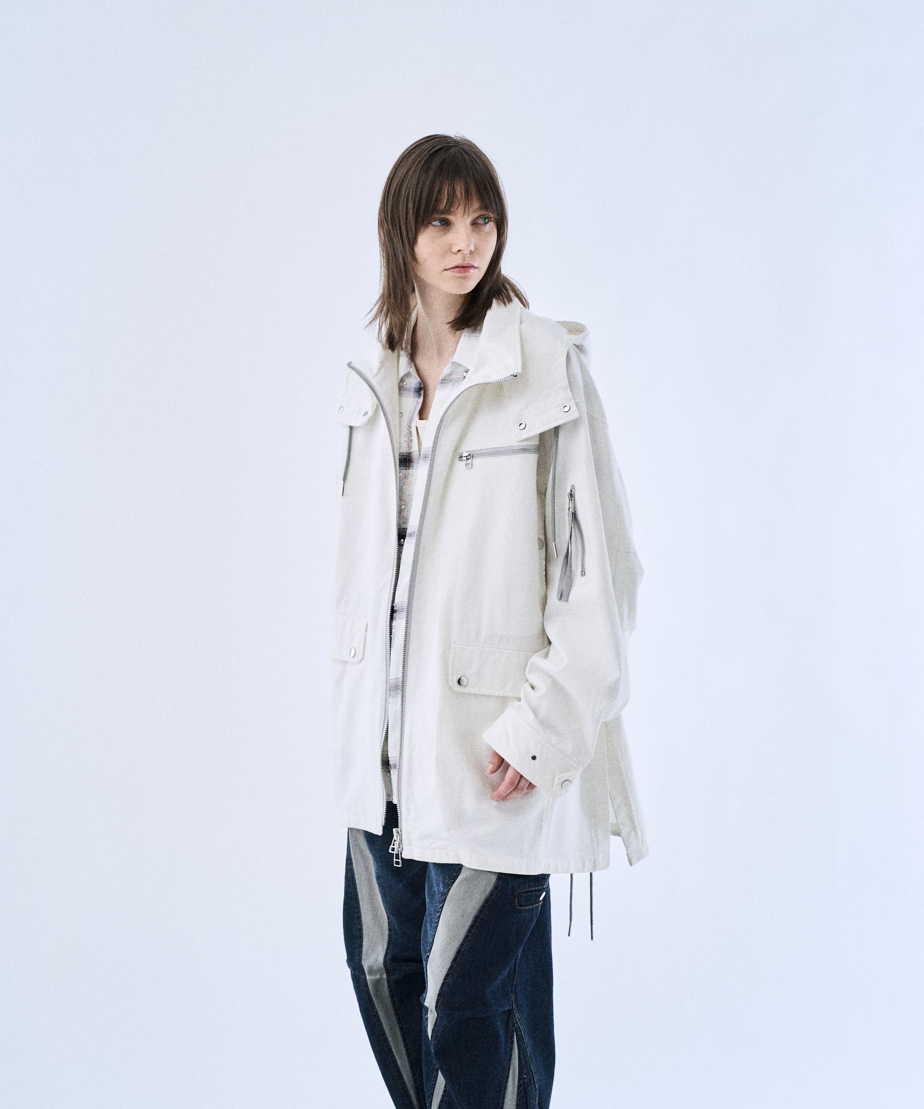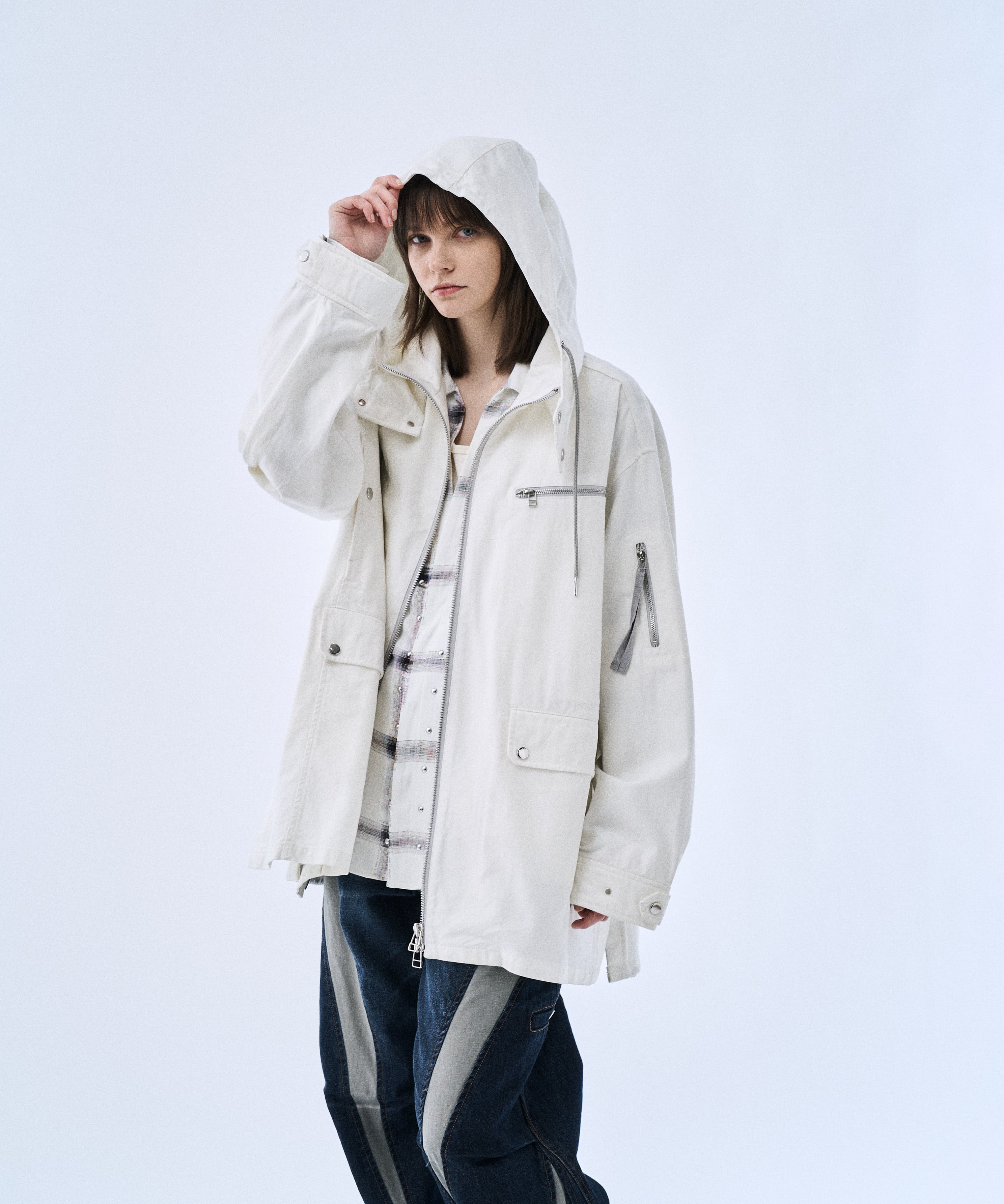ミリタリーパーカーをベースに、背面グラフィックでアクセントを加えた「Back graphic military parker」。程よくゆとりのあるシルエットとフードデザインで、Tシャツやスウェットの上からラフに羽織るだけでスタイリングが完成します。フロントはジップ仕様、裾はドローコードでシルエット調整が可能。軽さと落ち感のあるレーヨン混素材で、無骨すぎずモードに着られるのもポイントです。カラーは引き締まるBlackと、クリーンに着られるWhiteの2色展開。