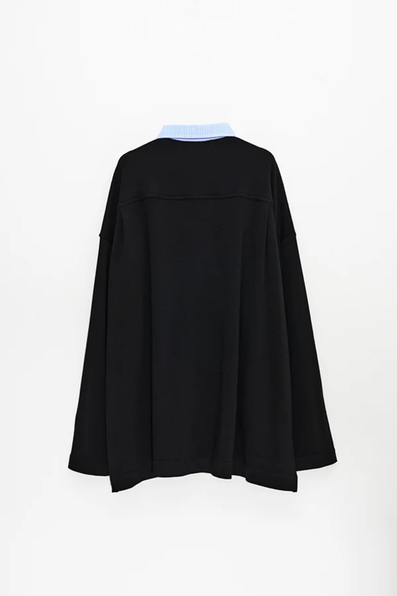 フロントのストライプシャツ部分がきちんと感を演出しつつ、身頃は柔らかなカットソー素材を使用することで、リラックスした着心地に仕上げています。