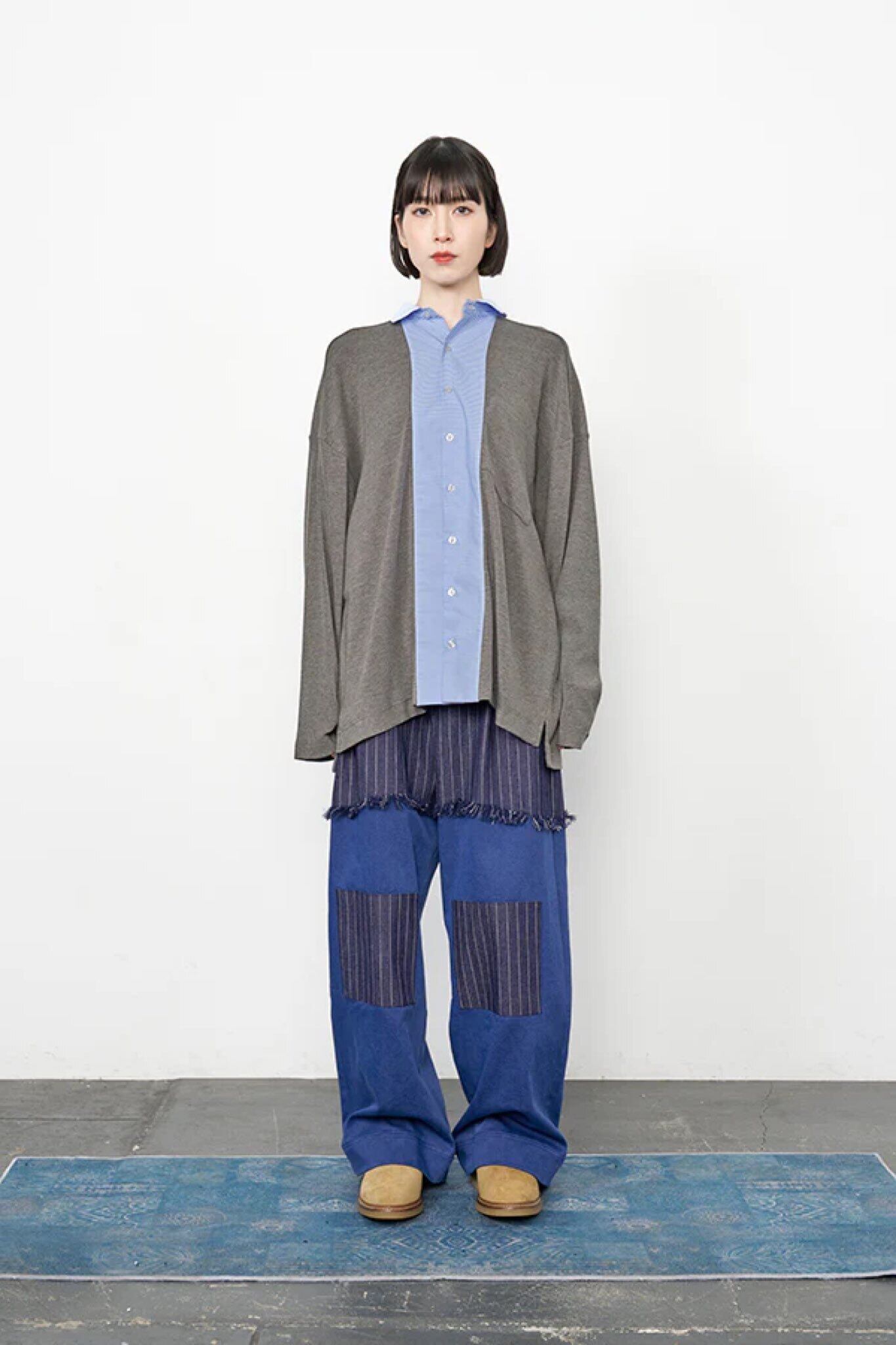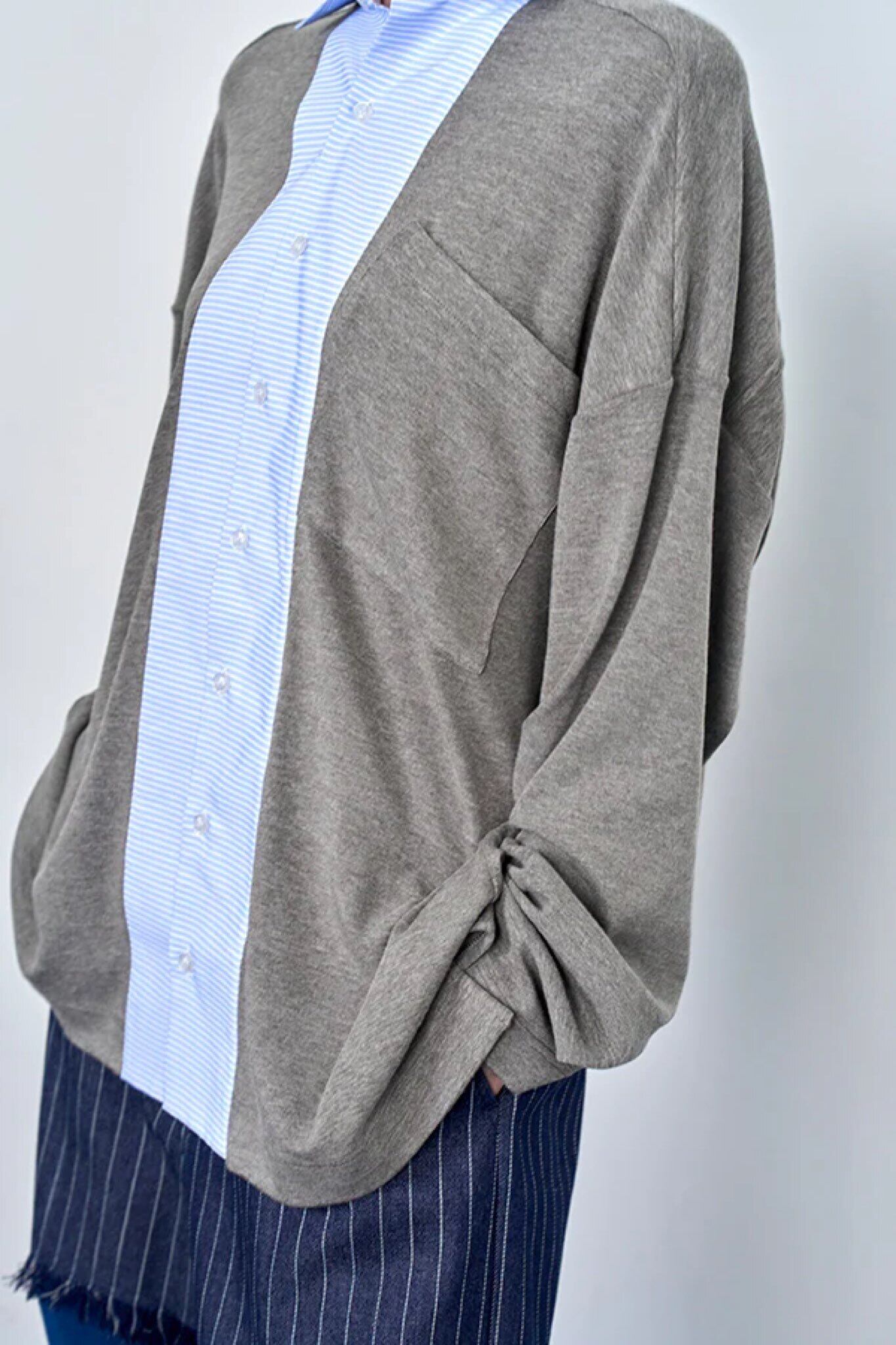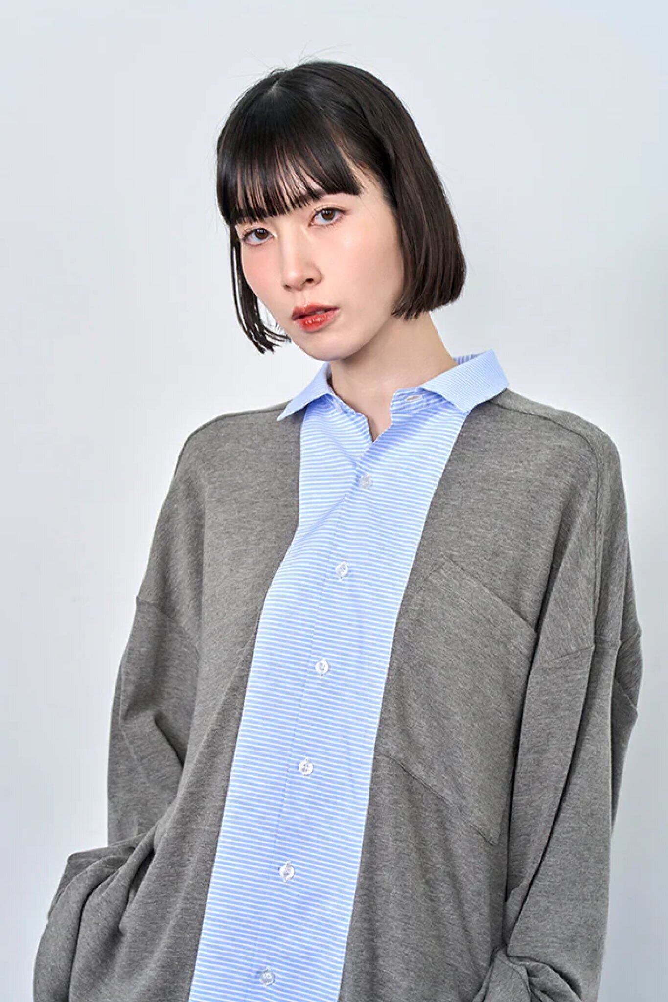 フロントのストライプシャツ部分がきちんと感を演出しつつ、身頃は柔らかなカットソー素材を使用することで、リラックスした着心地に仕上げています。