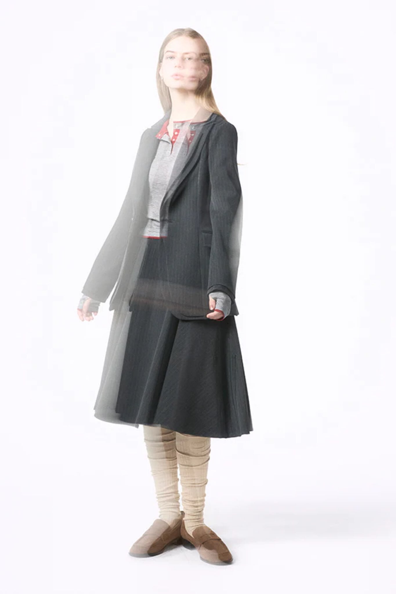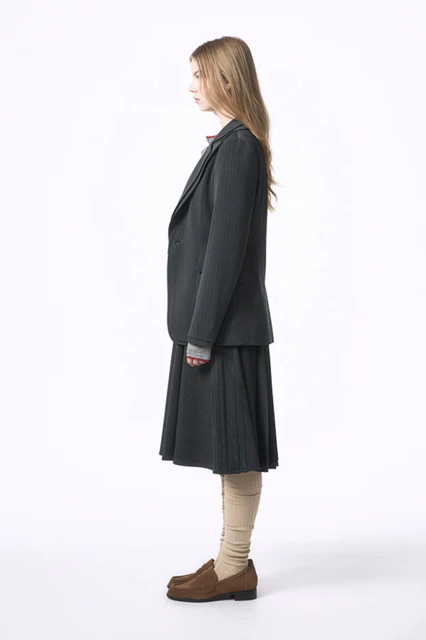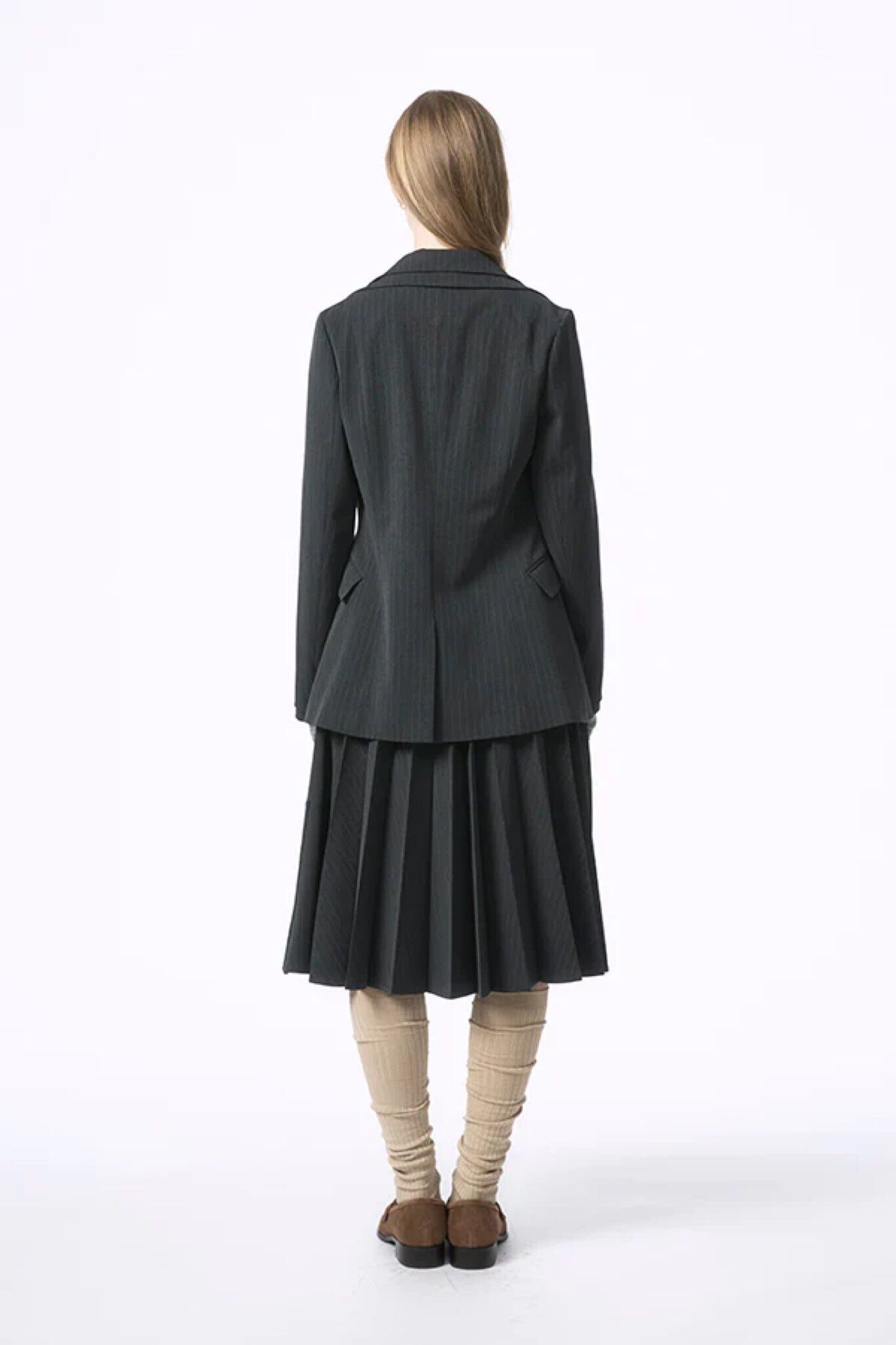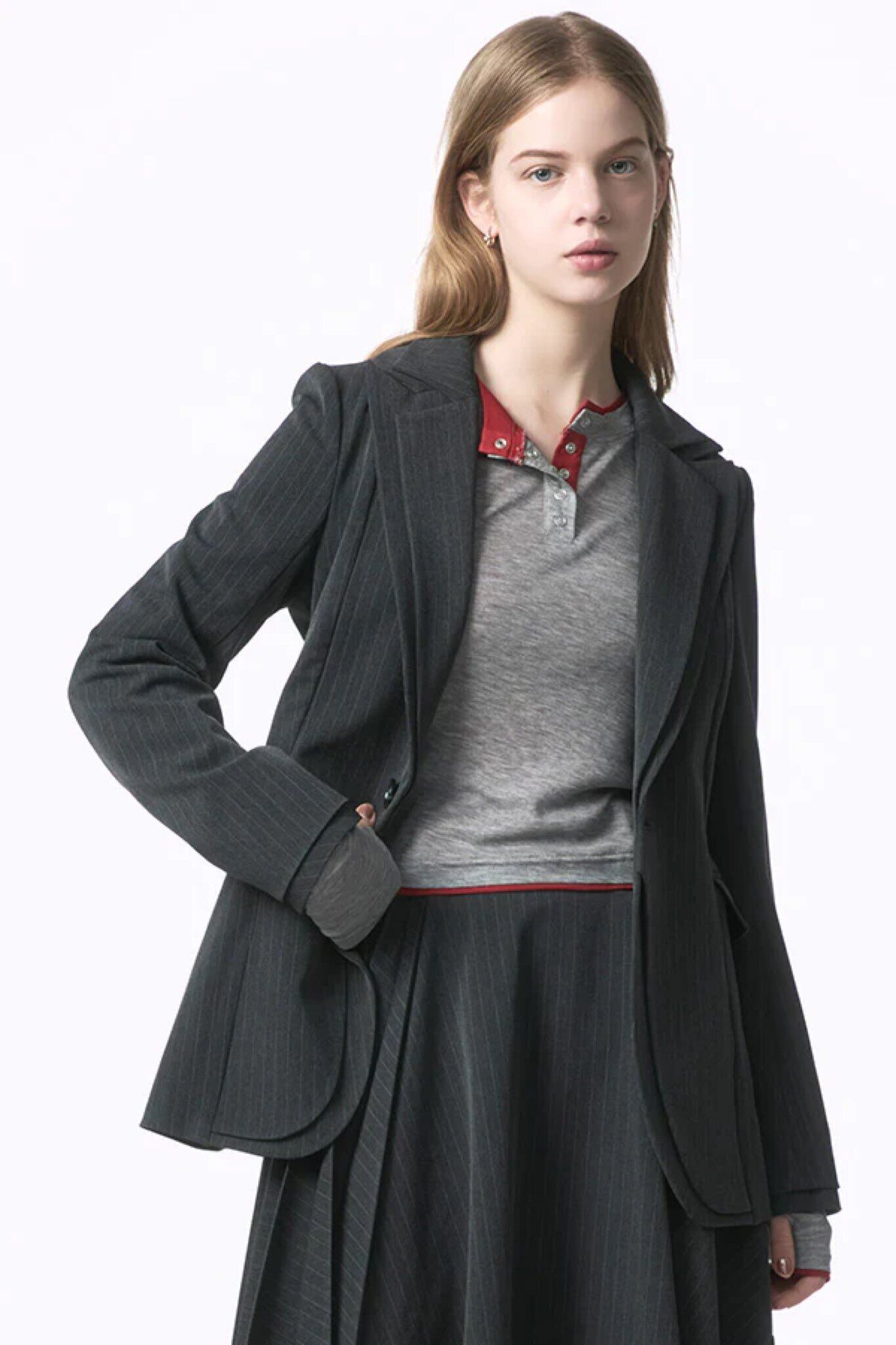 程よくシェイプされたウエストラインと、長すぎない着丈が、マニッシュでありながら女性らしいバランスを演出します。