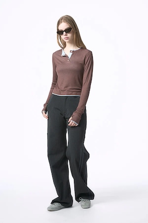 異なるカラーを重ねたダブルレイヤーデザインが印象的なヘンリートップ。