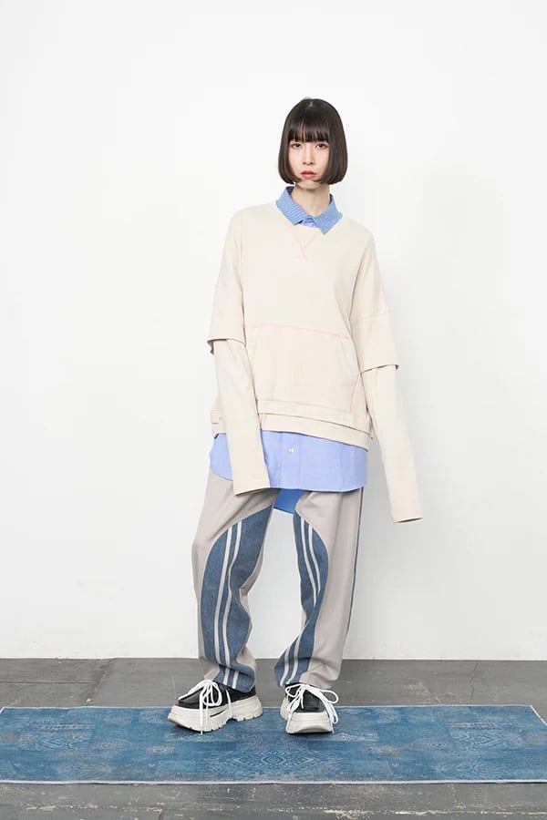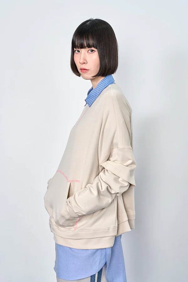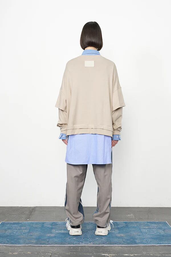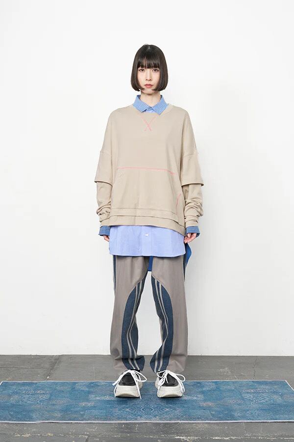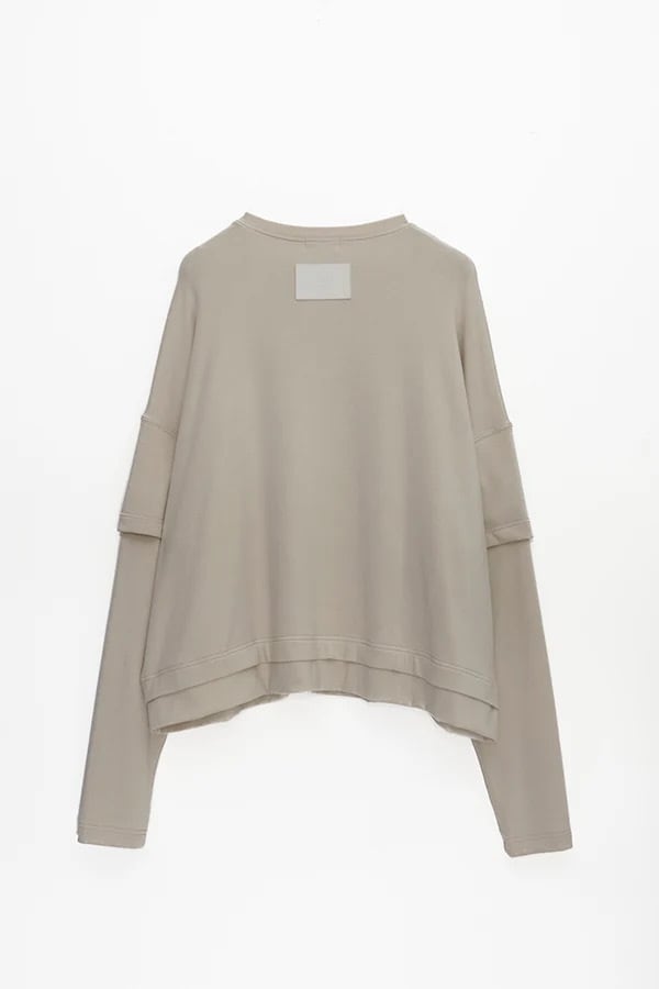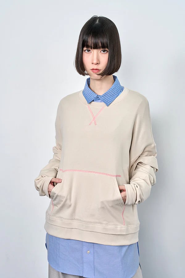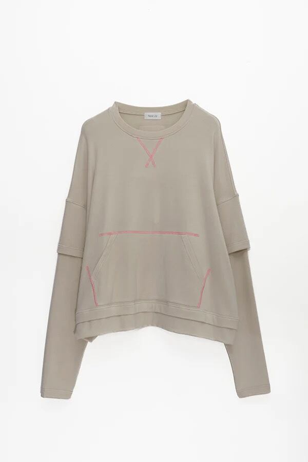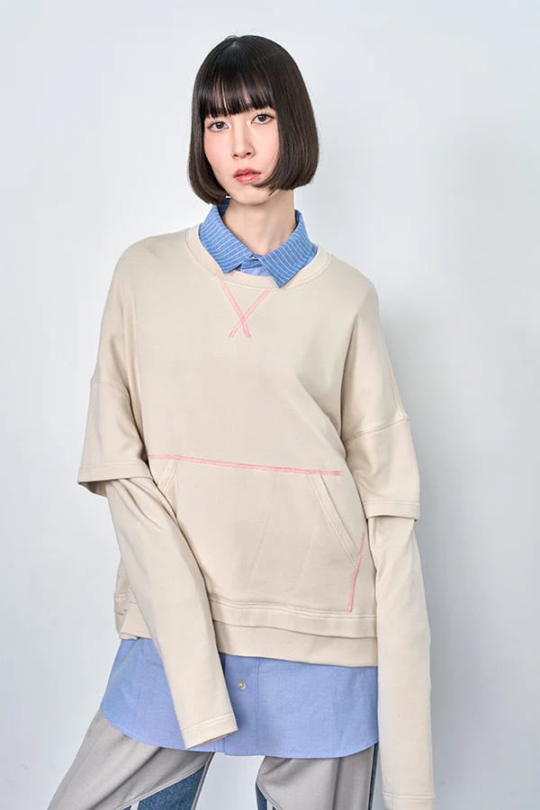配色ステッチがアクセントになった、レイヤード風デザインのロングスリーブTシャツ。