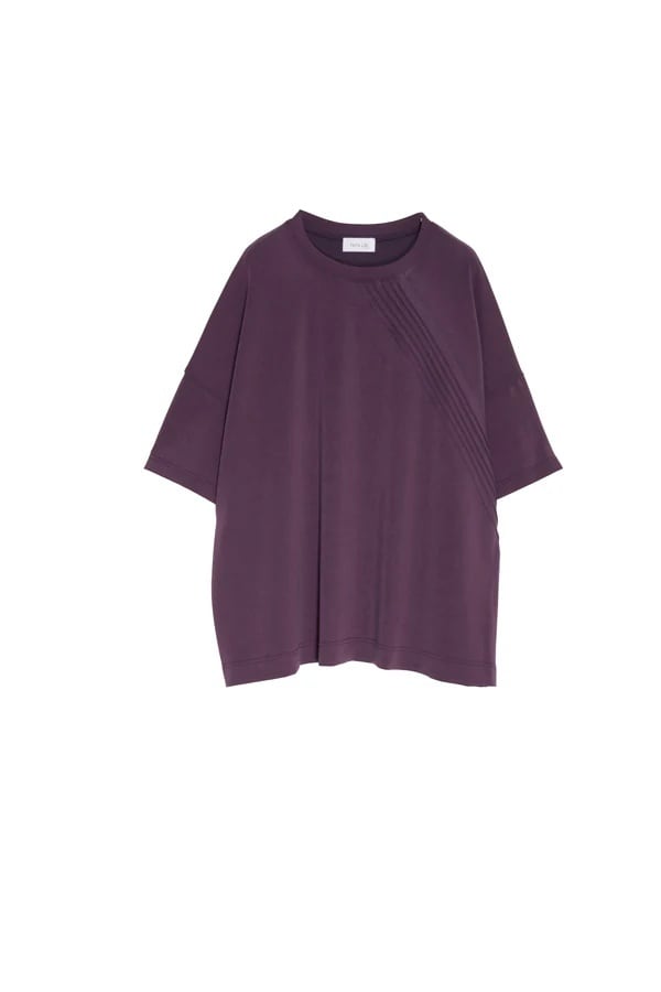 斜めに走るタックデザインが印象的な、ミニマルなデザインTシャツ。