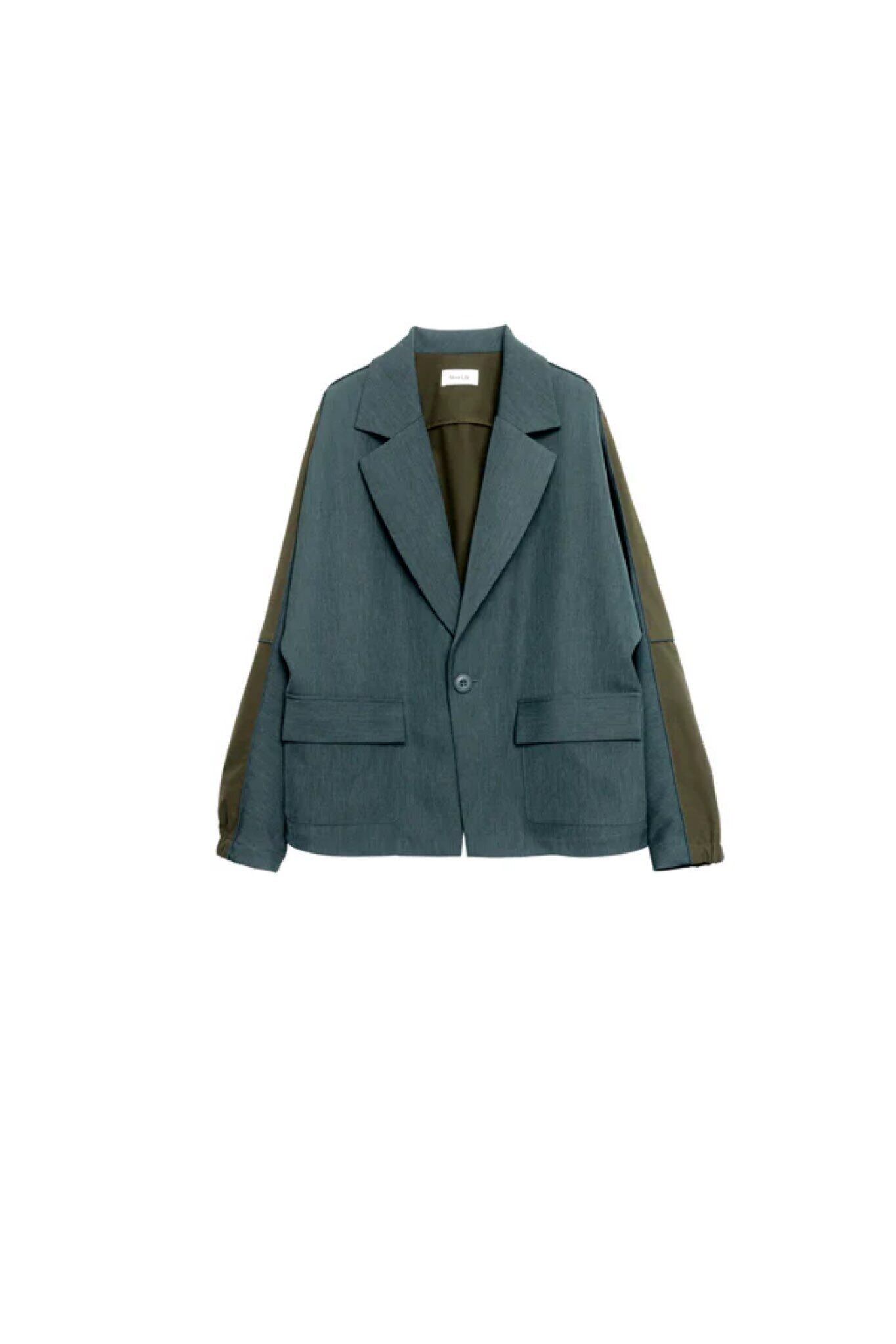 異素材の切り替えデザインが目を引く、モダンな印象のユニセックスジャケット。