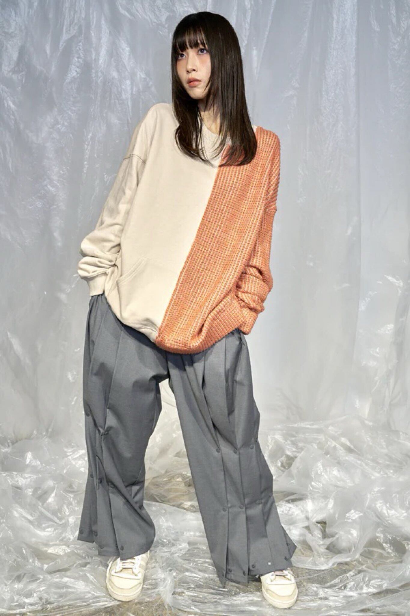 ユニークなデザインが目を引く「Tricky Switching Pullover」。異なる素材の切り替えが大胆で、コーディネートに新鮮さをプラスします。柔らかな風合いの素材とリラックス感のあるシルエットが、快適な着心地を実現。ユニセックス仕様のため、性別を問わず幅広いスタイリングに対応します。一枚で存在感のあるデザインは、シンプルなボトムスと合わせるだけで洗練された印象に。カジュアルからモードまで、様々なシーンで活躍するアイテムです。